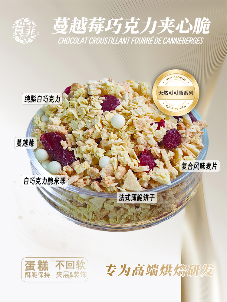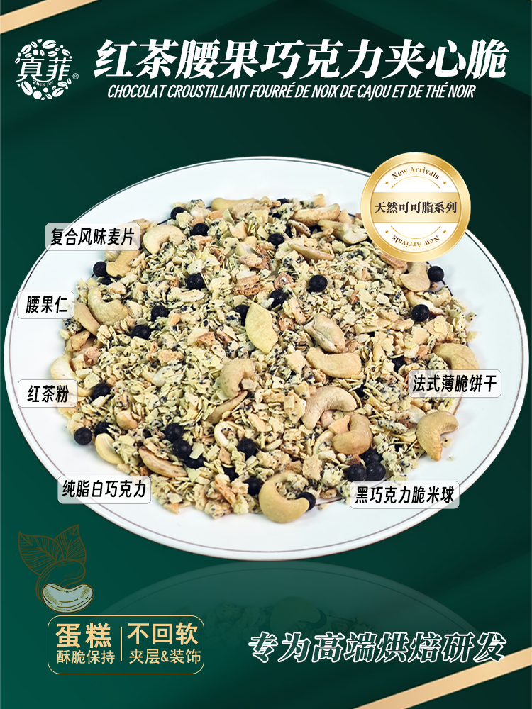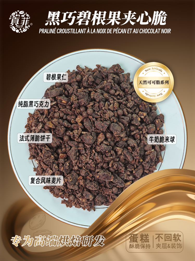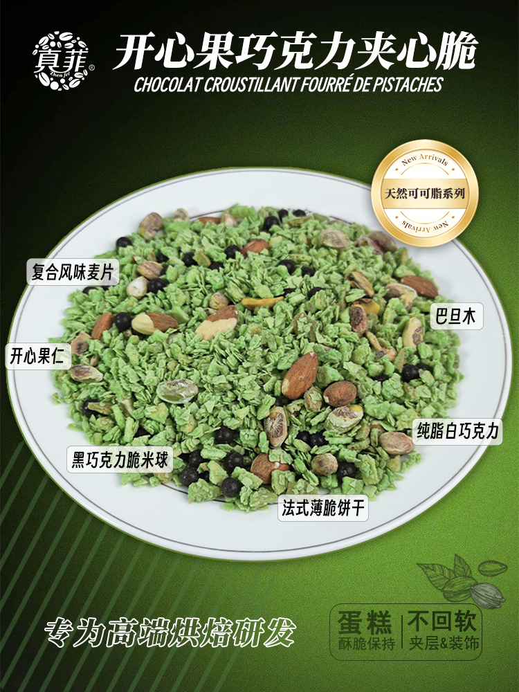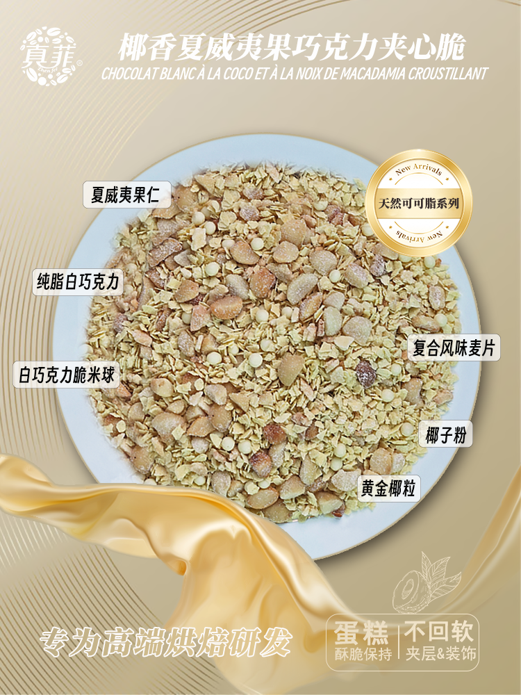 多种口味坚果,甜品装饰、蛋糕夹心均合适,20%以上的坚果添加量和纯脂巧克力,能保证6个小时以上的酥脆程度。